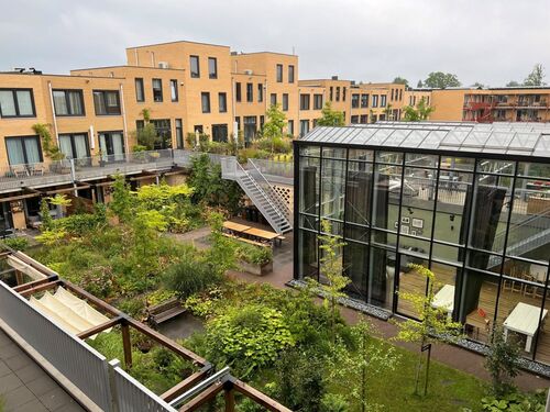 Dit deden we ook voor Kas&Co. We introduceerde deelauto’s van WeDriveSolar en gaven alle individuele parkeerplekken een eigen laadpaal om elektrisch rijden optimaal te stimuleren. De unieke binnenplaats is gerealiseerd met veel en verschillende groenvoorzieningen waarbij de bewoners zelf de mogelijkheid kregen (en krijgen) om de groensoorten in te vullen voor de moes- en kruidentuin. Op de unieke binnenplaats zijn de groenvoorzieningen gecombineerd met ontmoetingsplekken voor bewoners. Het hele concept is immers gericht op ontmoeting tussen jong en oud. In de benedentuin vangen we water op in een vijver. Dit water benutten de bewoners voor bewatering van de tuin. De hittestress beperken we dankzij de grote bomen die schaduw creëren op de woningen.